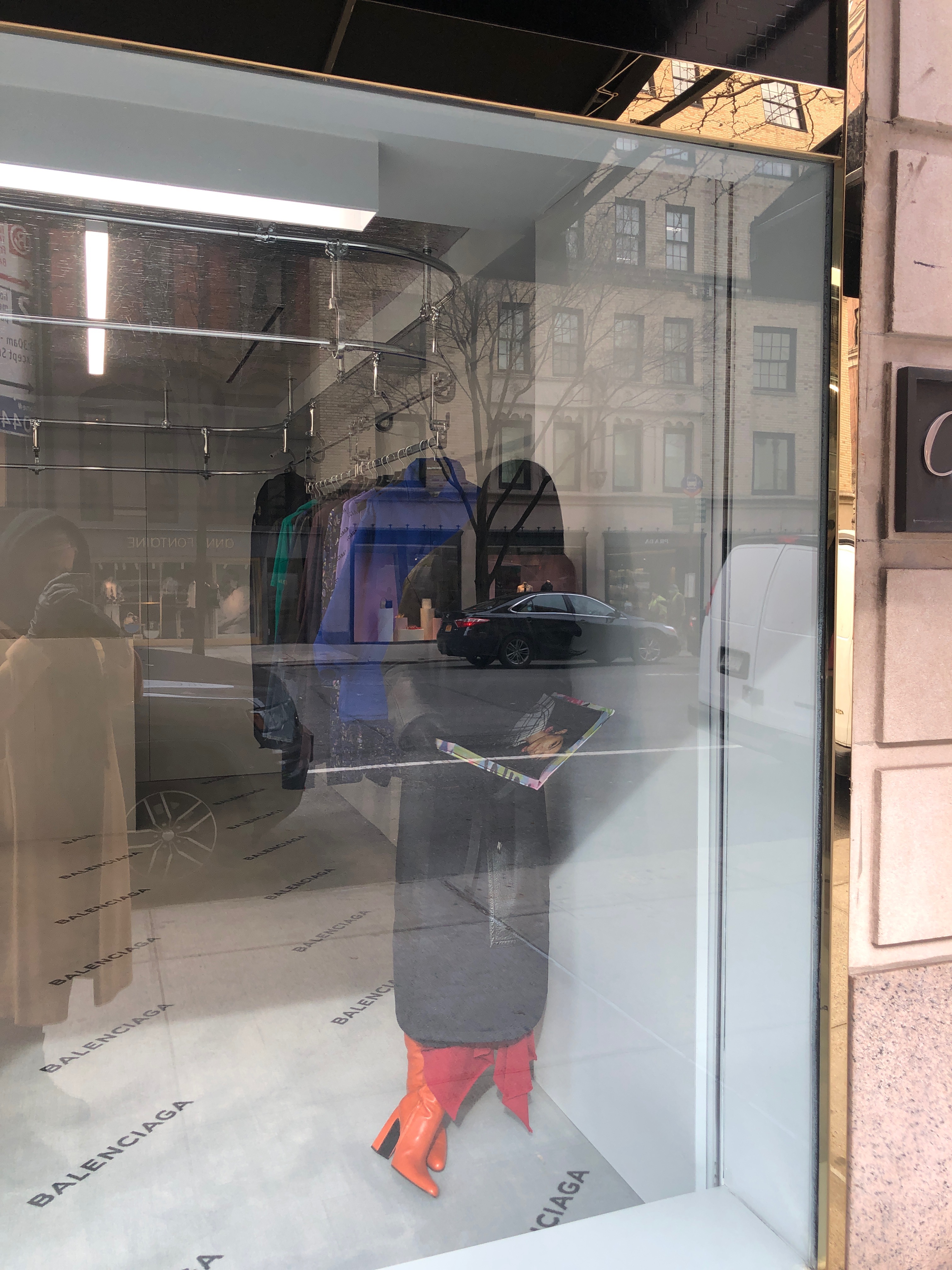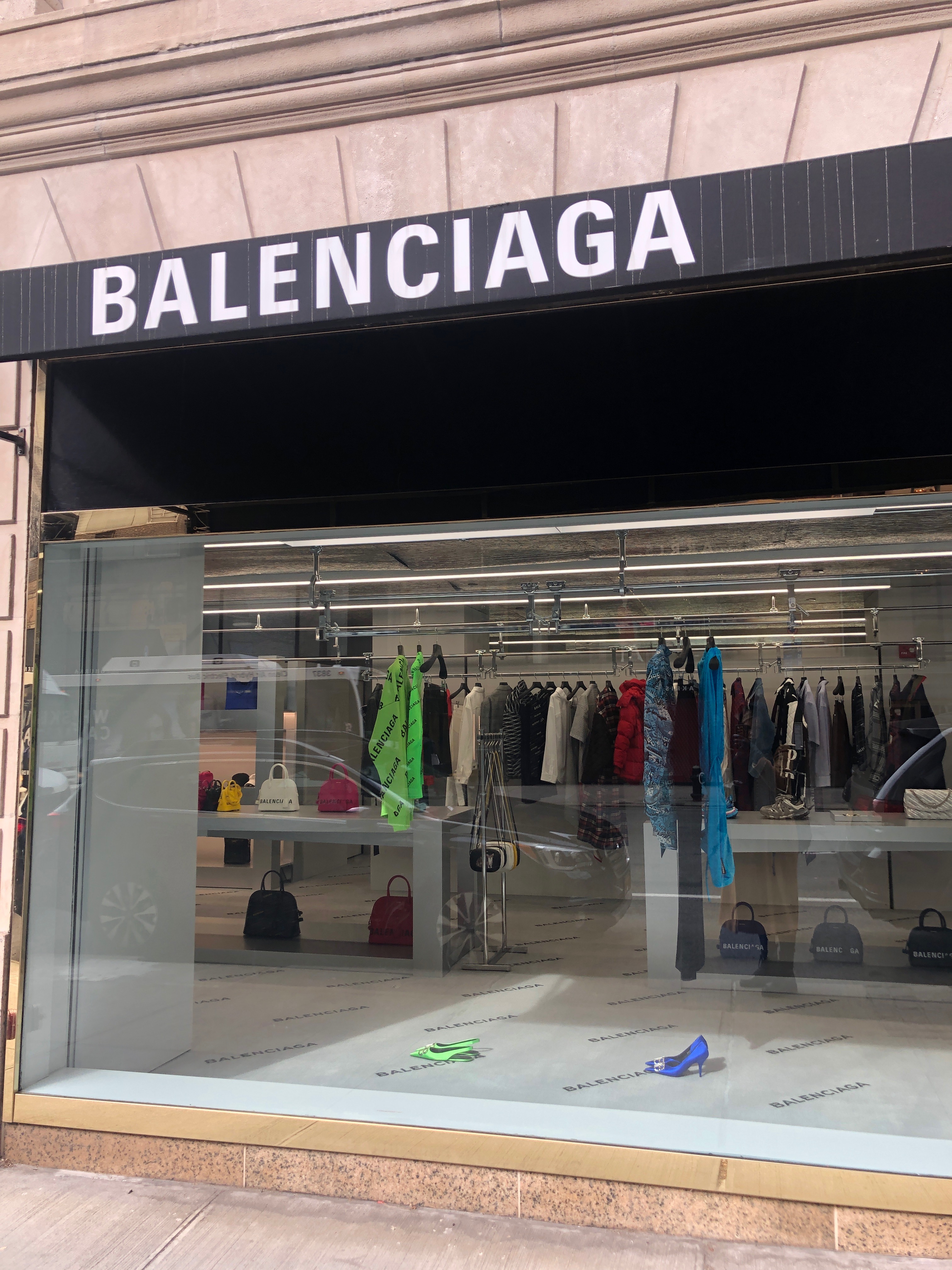 This is the visual display for the Balenciaga store on their Madison Ave location. Balenciaga stands out on the avenue, because of their edgy aesthetic. We can see lots of bright/neon colors and animal prints.